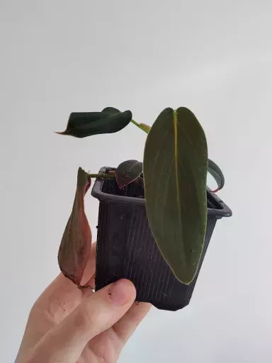 Zakořeněná rostlinka Philodendron Gigas. Listy mohou dorůstat velkých rozměrů.