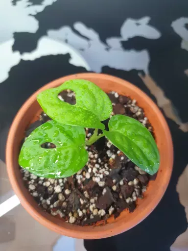 Malá rostlinka monstery adansonii. Rostlinka přesně jako na fotkách. Prodávám i s terakotovým květináčkem a miskou.