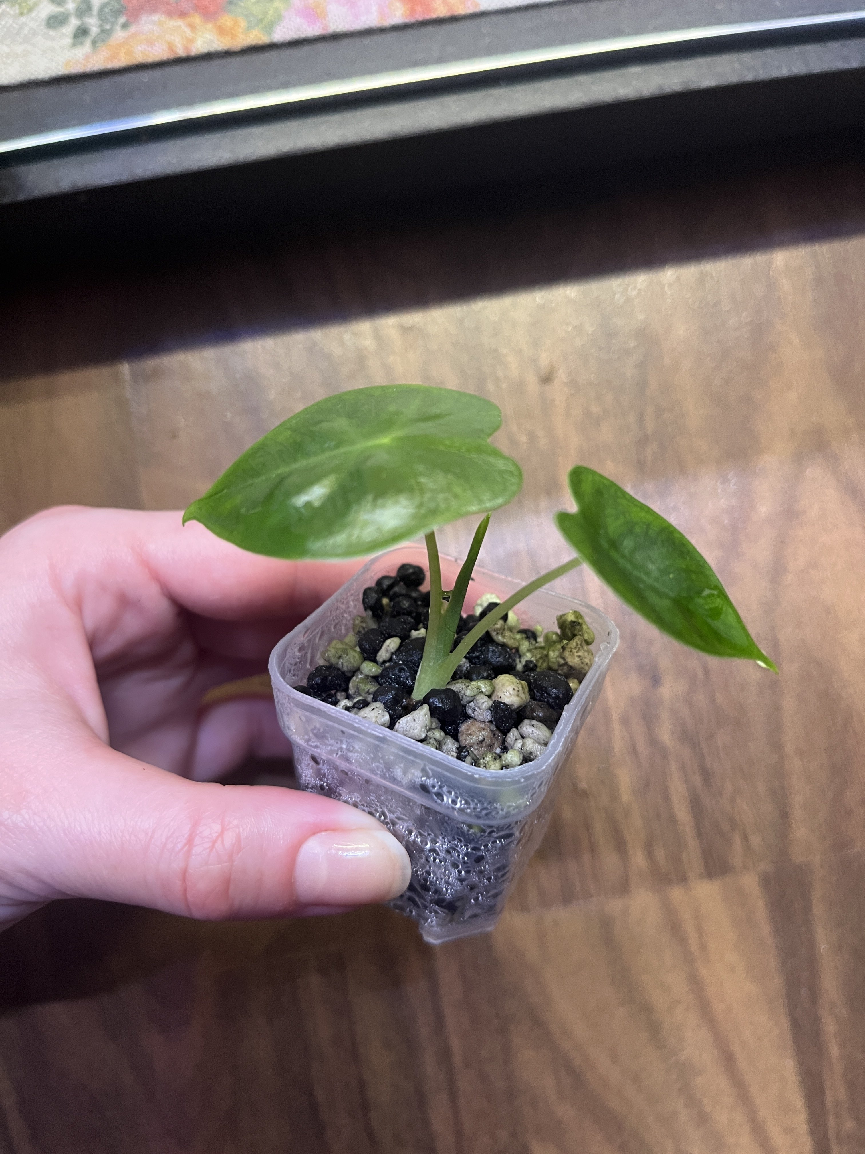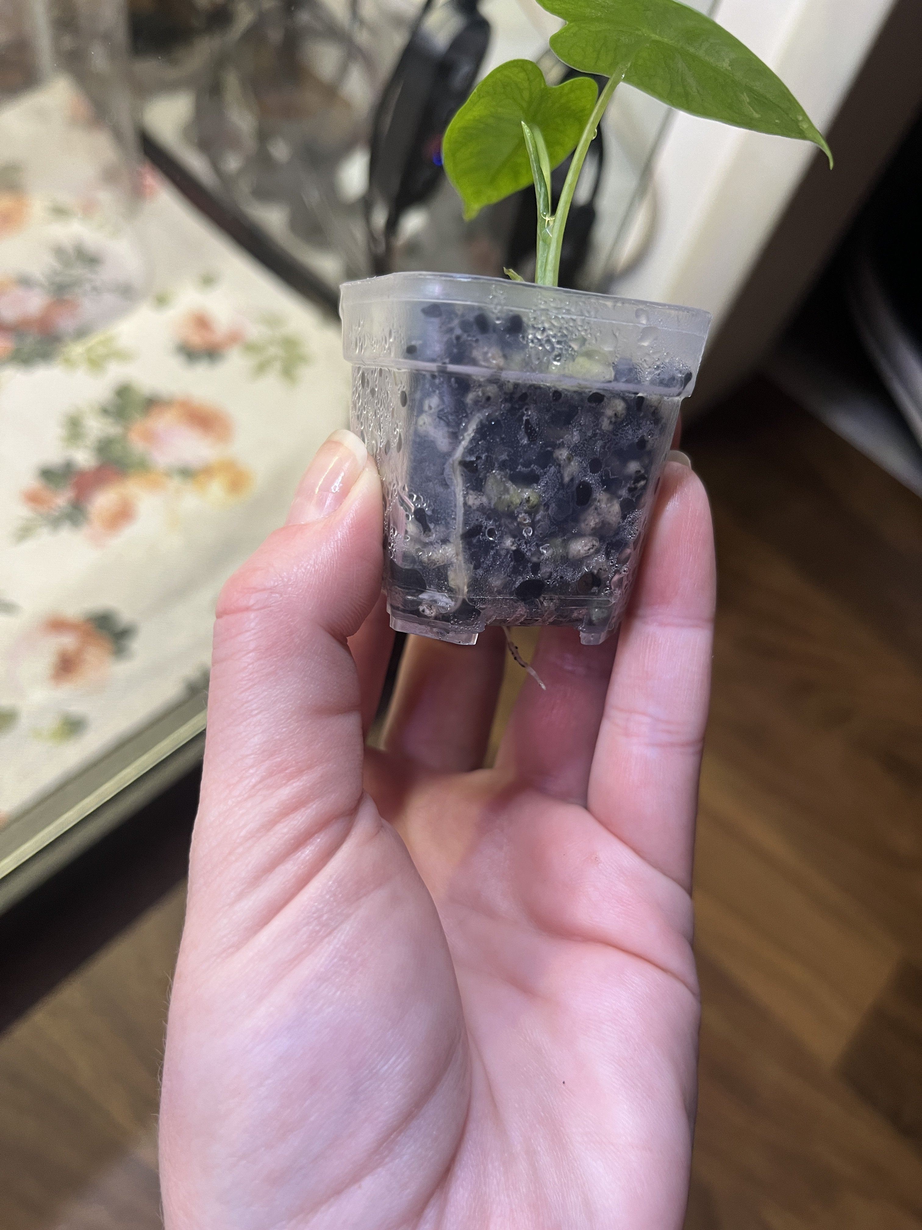 Baby rostlinka Alocasia Frydek. Pěkně zakořeněná a zdravá. Mateční fotka přiložena