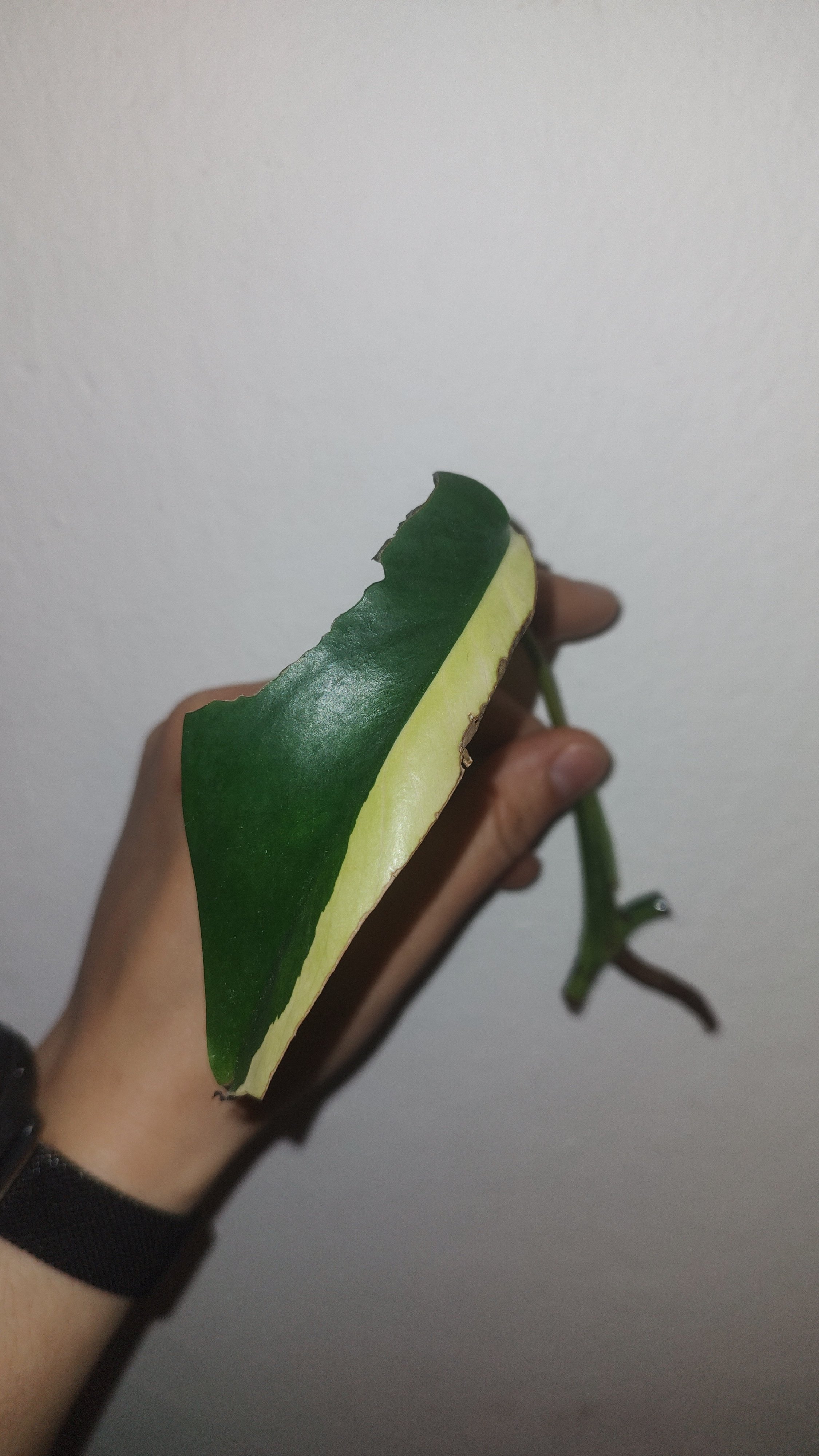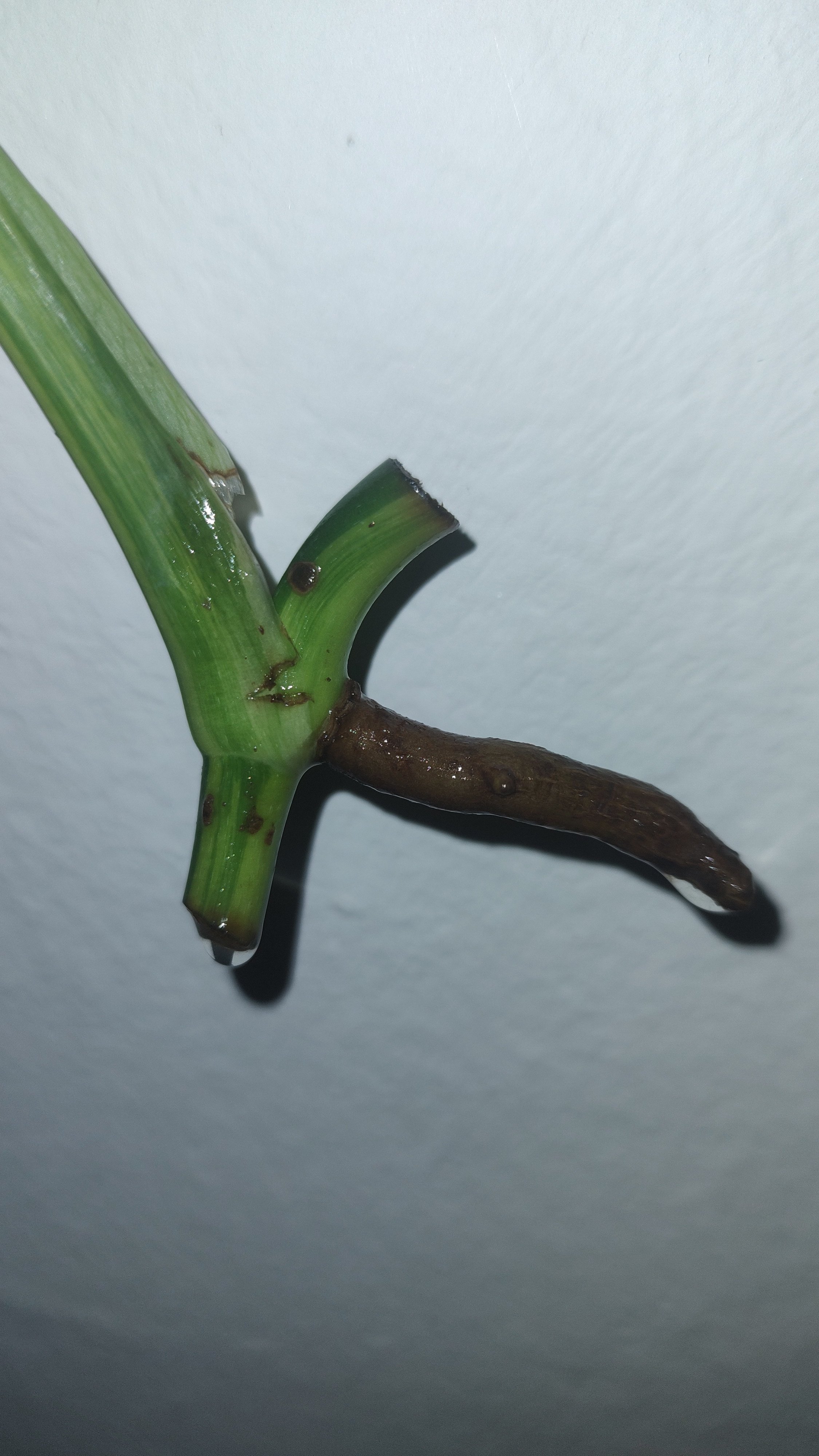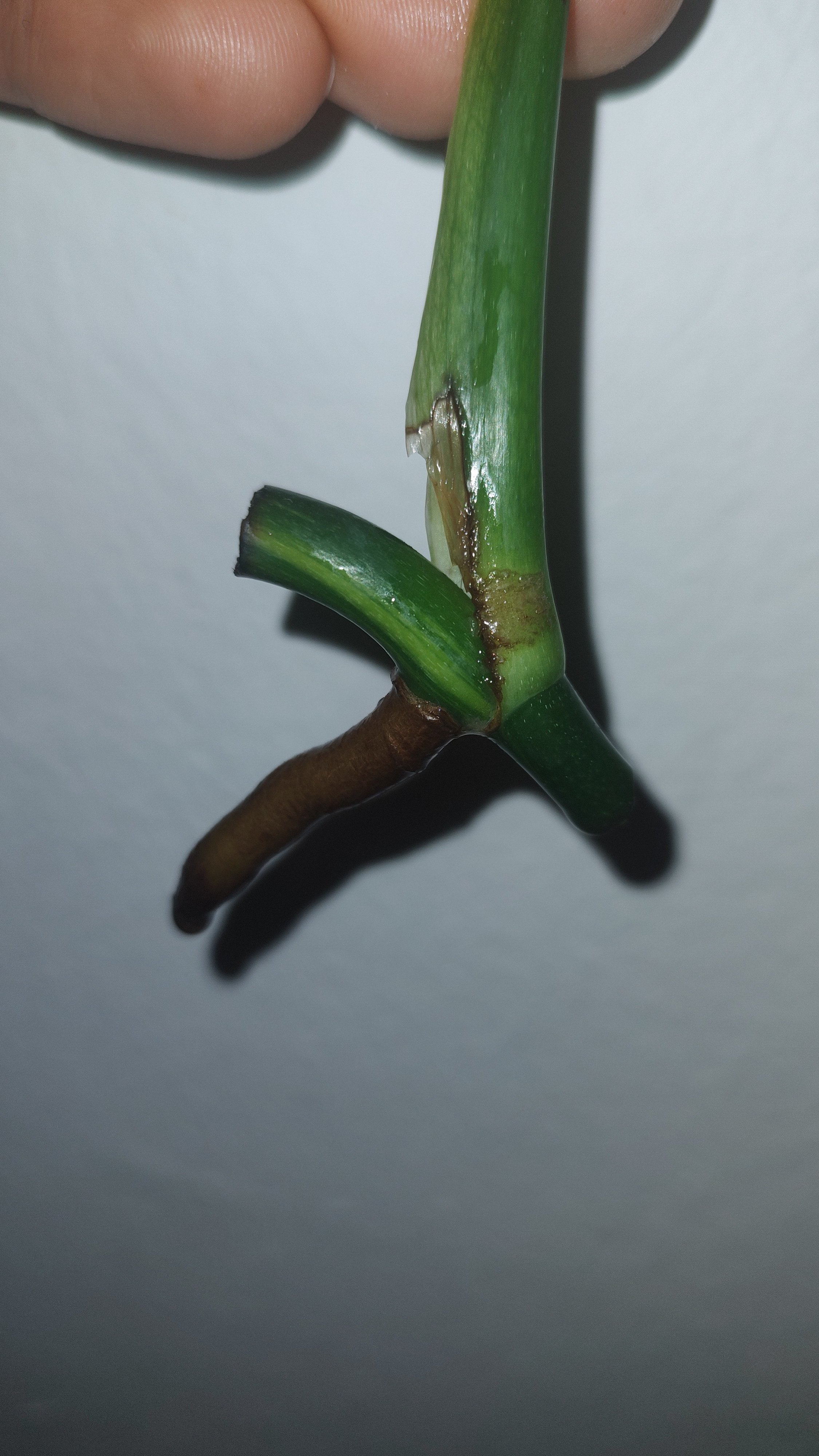 Stonkový řízek so vzdušným koreňom, rastový bod veľmi dobre nevidno, ale určite tam bude 😁 pôvodný list bol half-moon, je okúsaný lebo oschol, každopádne sfarbenie na stonke je krásne takže má veľký potenciál spraviť veľa parády za málo peňazí s teochou trpezlivosti a lásky 😁