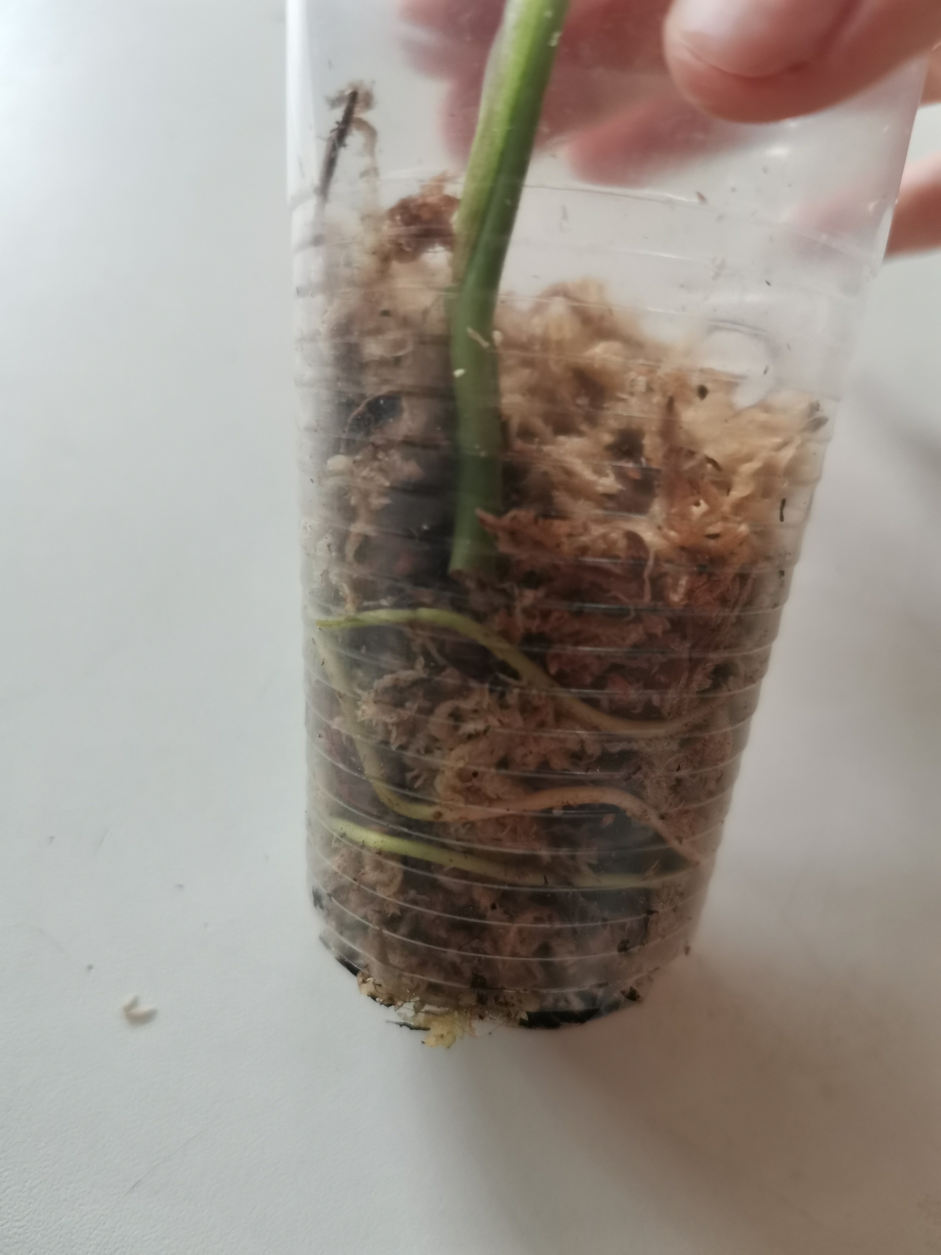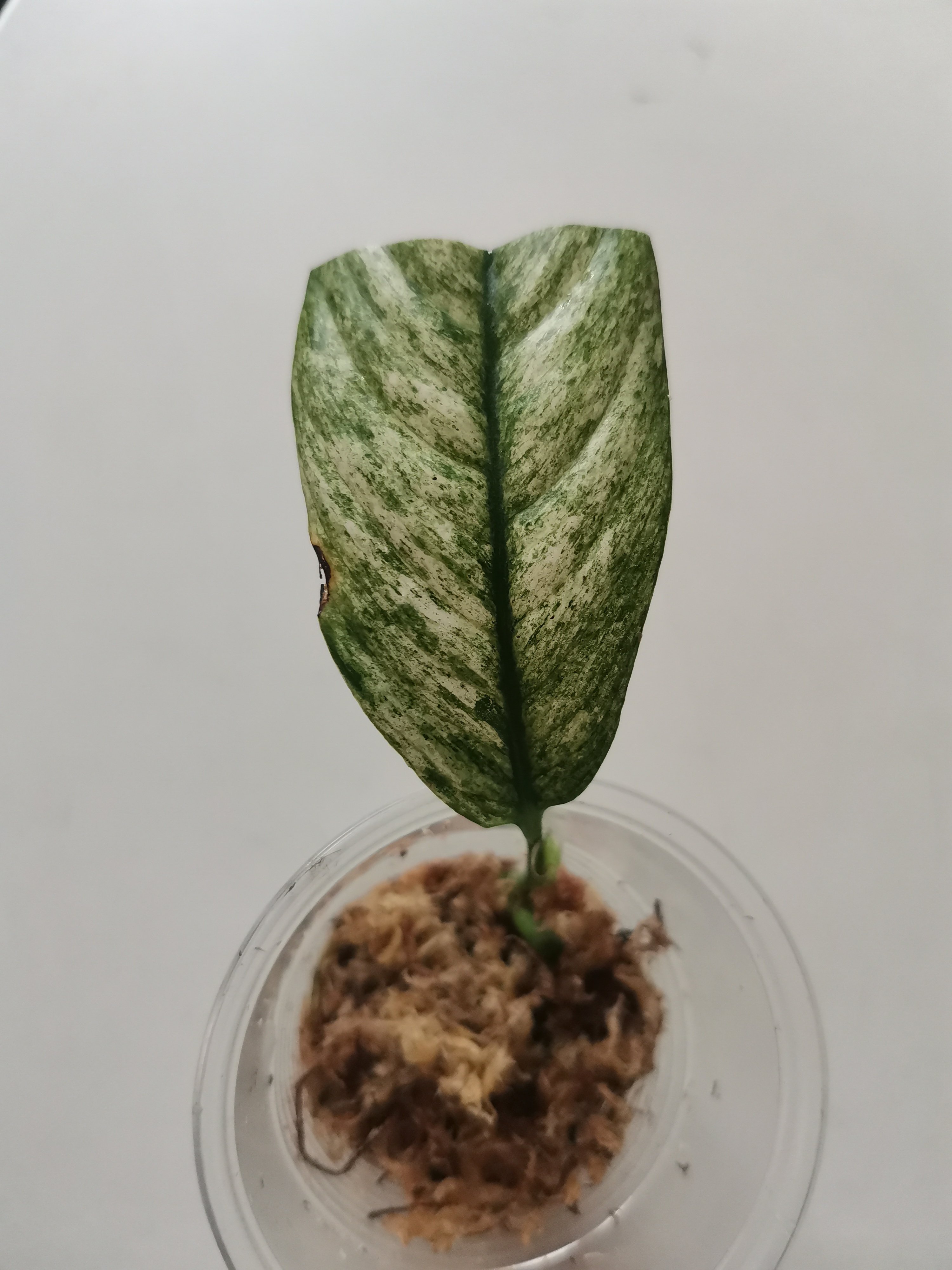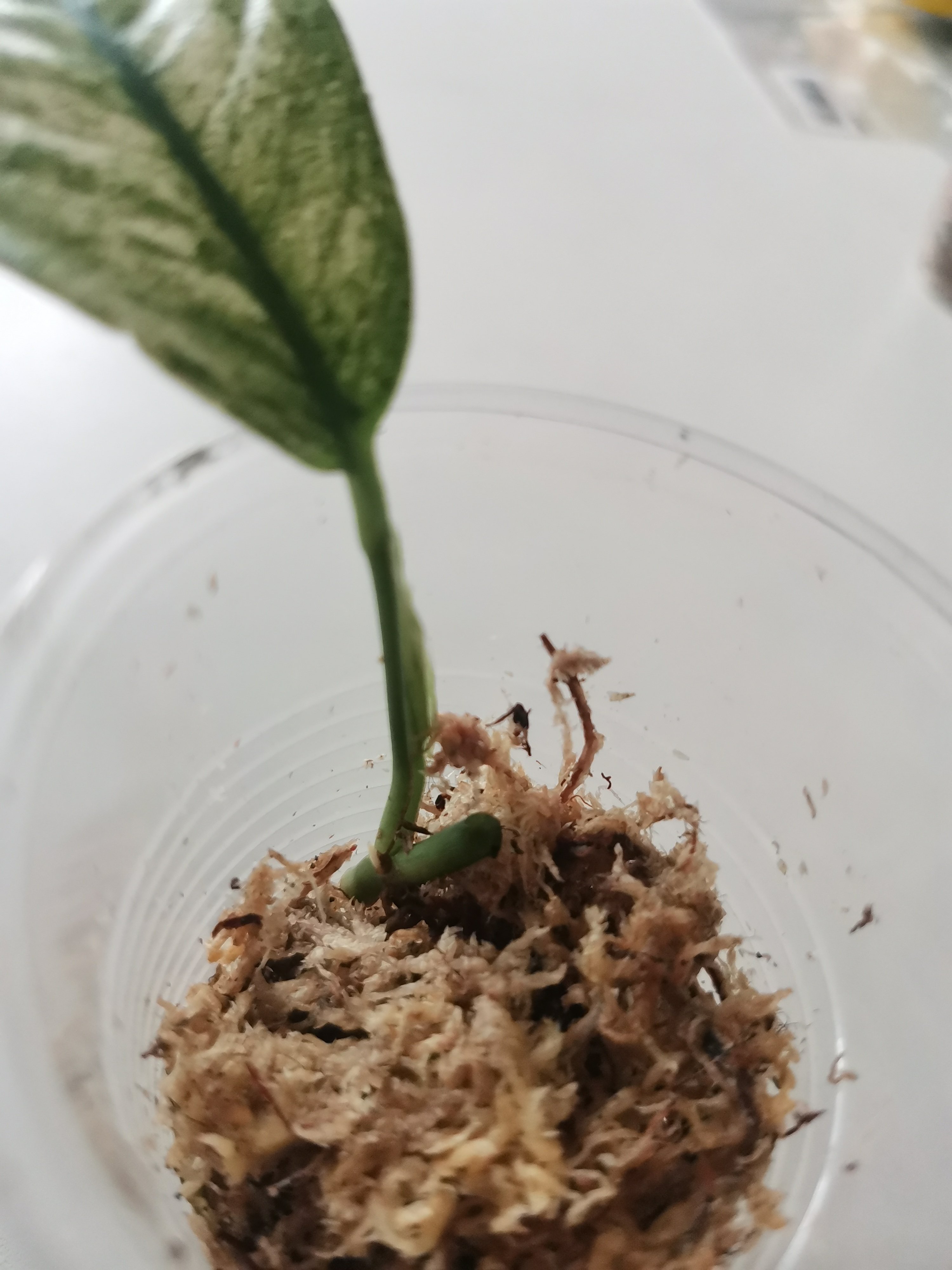 Zakořeněný řízek Rhaphidophora puberula variegata. Růstový bod je již aktivní, je vidět na fotce. Poslední fotka z webu, jak vypadá v dospělosti.