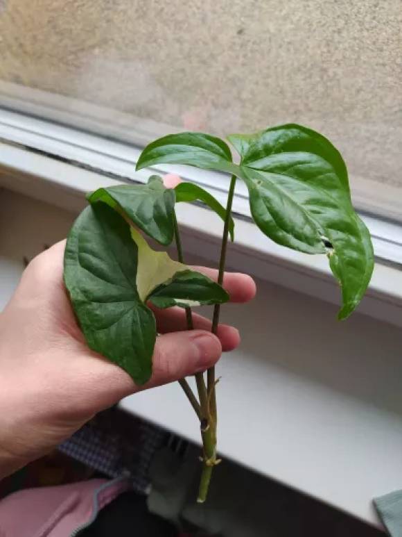 Vrcholový řízek mého synga o třech listech. Pravděpodobně revertovaný, poslední dva listy jsou zelené... Foto mateřské rostliny přiloženo.